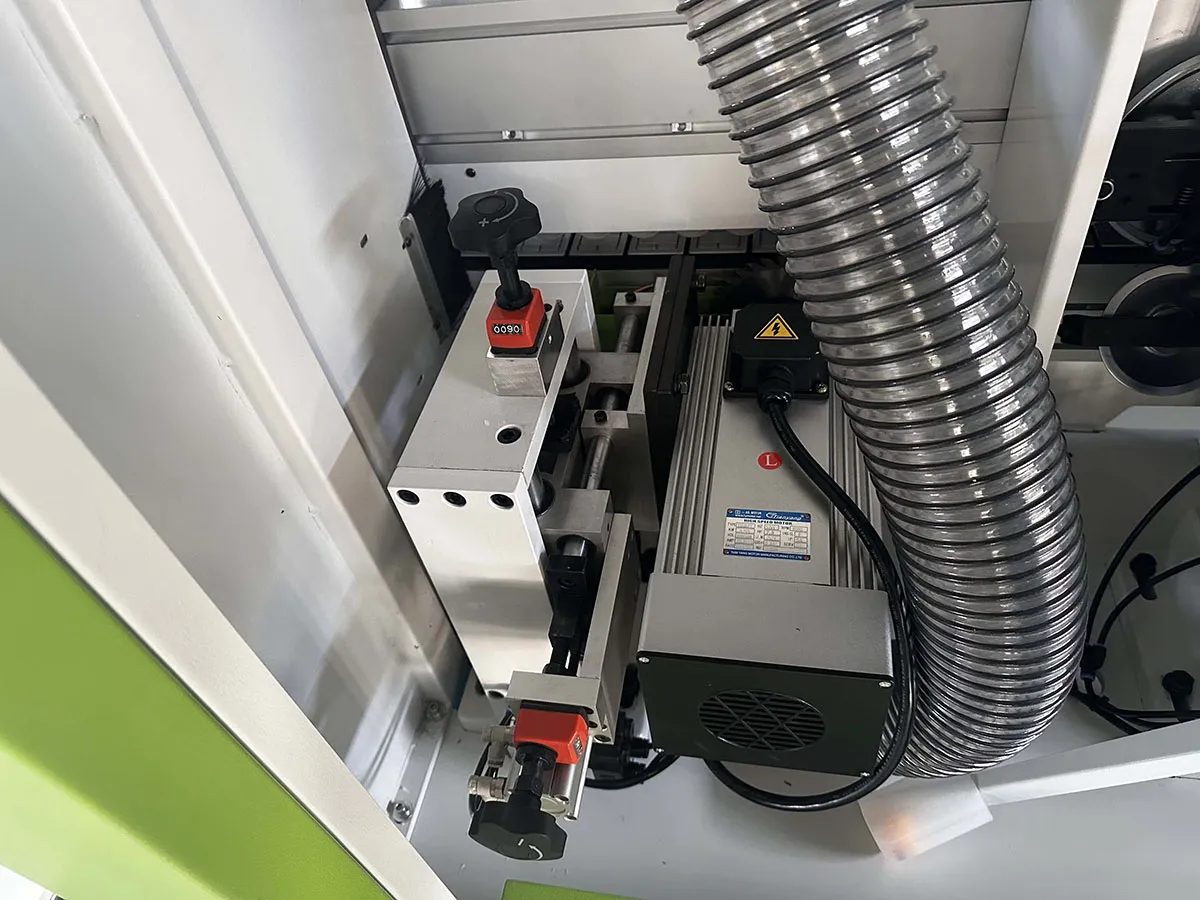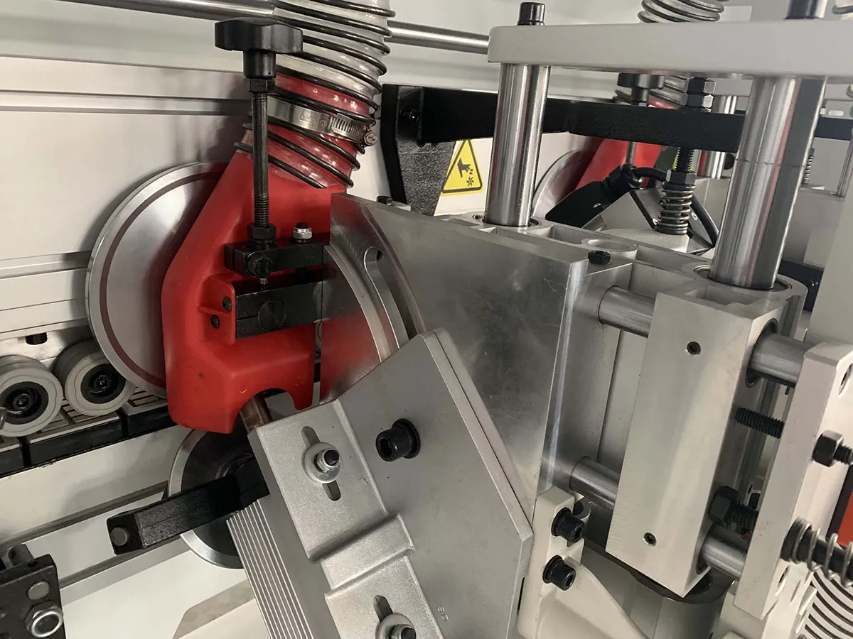 Double glue tanks, 1 large pressing wheel and 5 small pressing wheels combined to fix the edge tape. Double guide rails front and rear end cutting, feeding speed 12-20 m/min, highspeed 4 heads corner rounding, automatic lubrication, electric pressing and lifting.